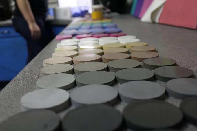 Color lab concrete pigment sample discs in wide color range.